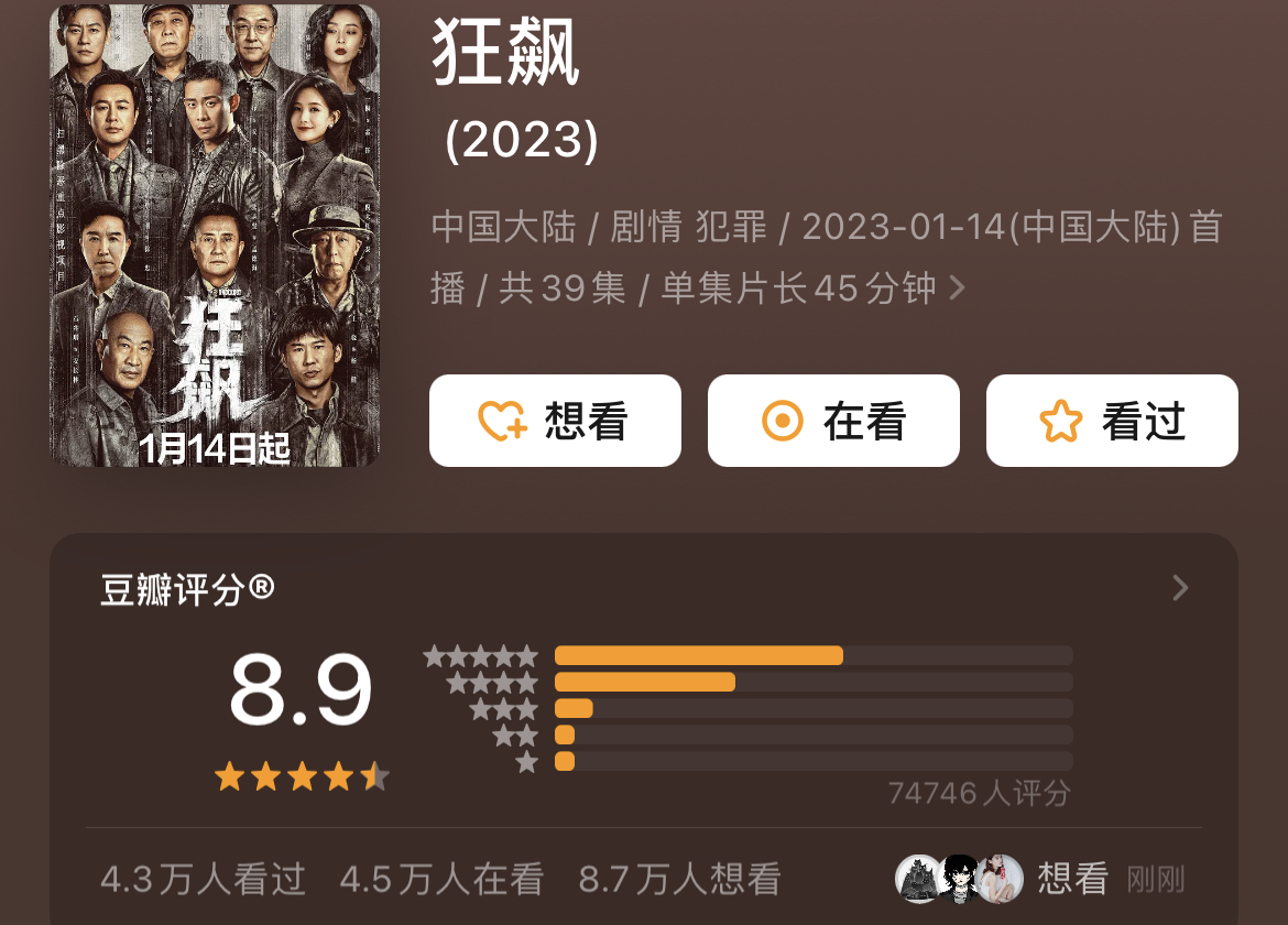 1月14日開播以來,由中央政法委宣傳教育局、中央政法委政法綜治信息中心指導的掃黑劇《狂飆》名副其實,一路狂飆,目前豆瓣評分已達8.9,近7.5萬人參與評分。