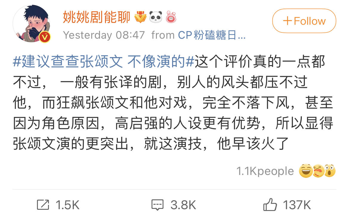 有入戲太深的網友因此調侃,建議查查張頌文,他這個涉黑頭目塑造得太真實,“不像是演的”,“演員身份是擋箭牌”。