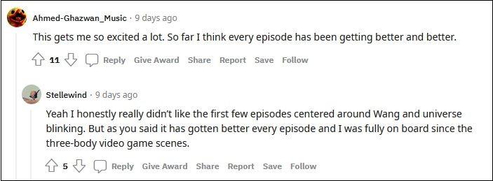 其他用户認同了這一觀點:“是的,老實説我真的不喜歡一開始那些聚焦在汪淼和‘宇宙閃爍’上的劇集。但正如你説的,這部劇越來越好,從‘三體’遊戲開始後,我就全情投入了。”
