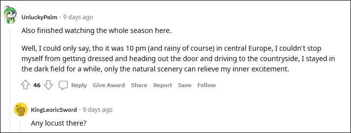 一名來自中歐地區的用户動情地寫道:“我也看完了整部劇。我只能説,儘管我所在的中歐地區已經晚上10點,還下着雨,但我抑制不住地穿上衣服,走出門去,開車去鄉下。我在黑暗的田野裏呆了一會兒,只有自然風景才能緩解我內心的激動。”