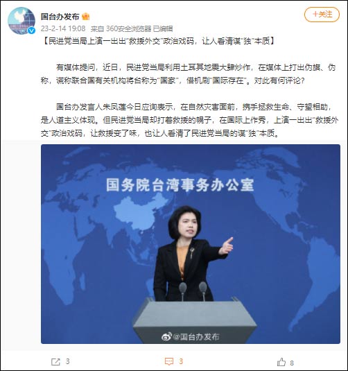 據@國台辦發佈 2月14日消息,有媒體提問,近日,民進黨當局利用土耳其地震大肆炒作,在媒體上打出偽旗、偽稱,謊稱聯合國有關機構將台稱為“國家”,藉機刷“國際存在”。對此有何評論?