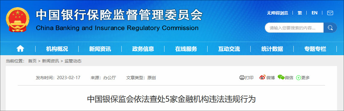 銀保監會網站2月17日消息,中國銀保監會依法查處5家金融機構違法違規行為。