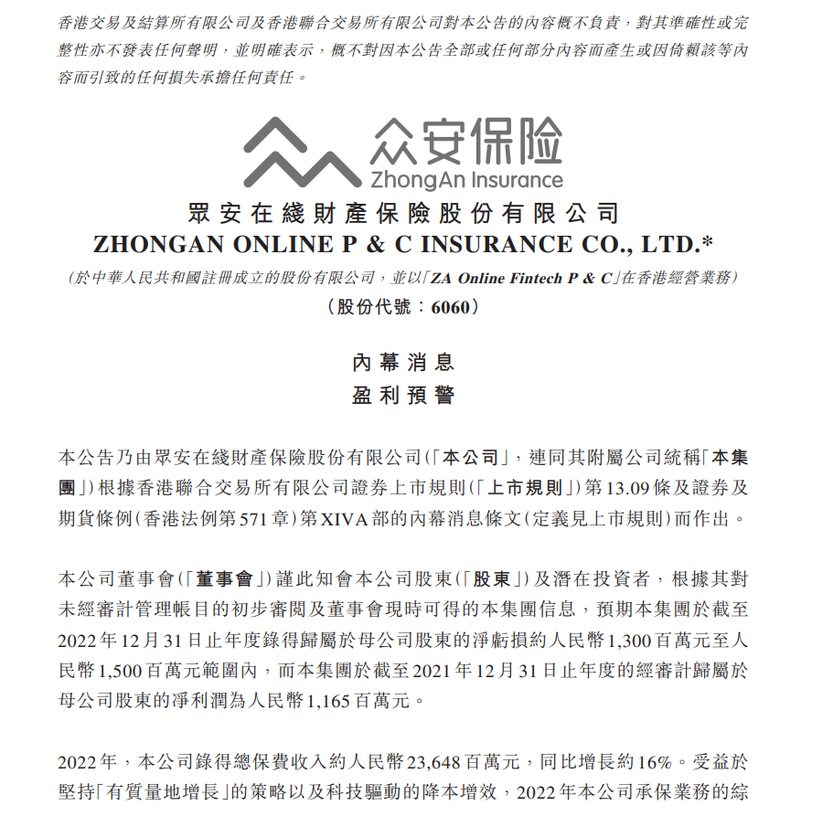 2月17日,港股上市公司眾安在線發佈盈利預警,預期集團2022年歸屬於母公司股東的淨虧損約人民幣13億元至人民幣15億元,而2021年經審計歸屬於母公司股東的淨利潤為人民幣11.65億元。