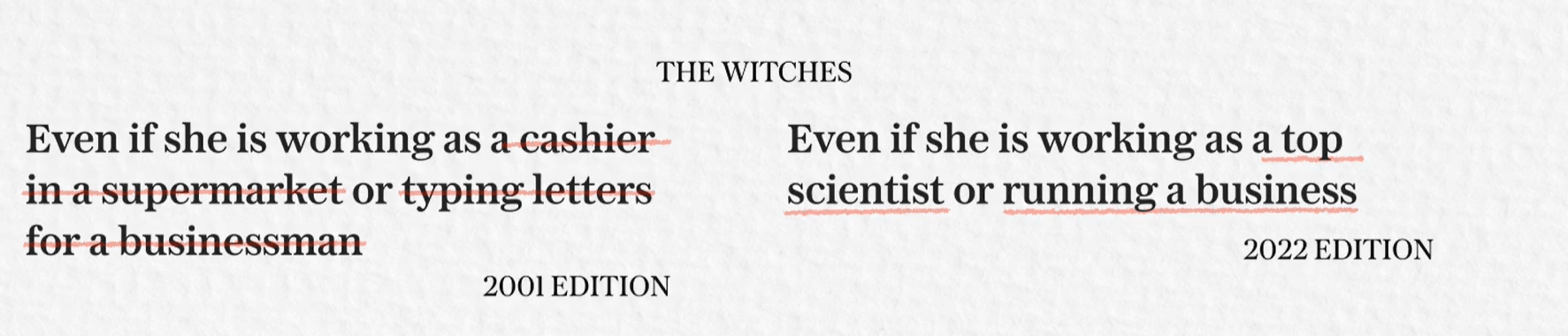 例如,達爾曾因在《女巫》等書中對女性的不利描寫而被稱為厭女者,在這次改動中,《女巫》一書發現了59處改動,許多改動都與女性形象有關。如在原著中邪惡的女巫會偽裝成普通女性,比如“超市收銀員”或“為商人打字”的女性,但在新版《女巫》中,她們成了“頂級科學家或企業經營者(top scientist or running a business)”。還有原著中“你一定是瘋了,女人!”變成了“你一定是失去理智了!”