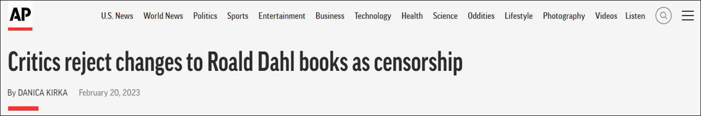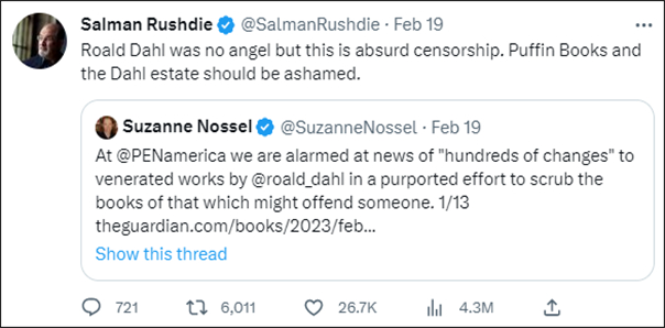 美國筆會(PEN America,一個由約7500名作家組成的倡導言論自由的團體)首席執行官蘇珊娜·諾塞爾(Suzanne Nossel)連發13條推文,表達對此的“震驚”。諾塞爾認為,這種有選擇地改動文學作品,使其符合特定情感的行為,可能是“一種危險的新武器”。她寫道:“如果我們一開始就試圖糾正那些被認為帶有輕蔑情緒的地方,而不是讓讀者按照原著來接受和回應書籍,我們就有可能扭曲偉大作家的作品,讓文學展示社會的基本視角變得模糊。”