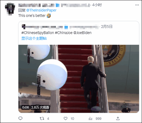 還有人翻出拜登之前登機摔倒的視頻,拿此前美媒熱炒的“間諜氣球”事件大肆惡搞:
