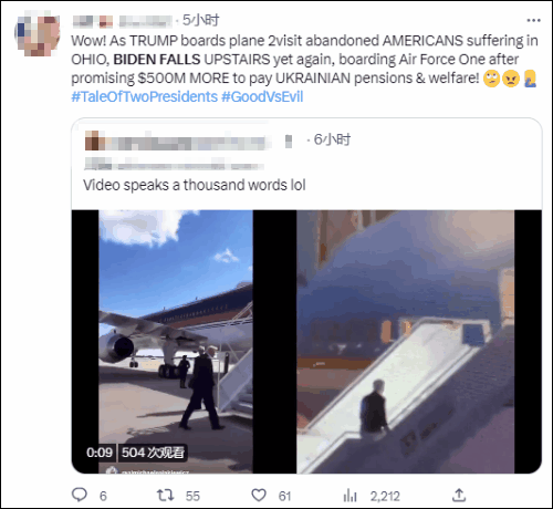 而就在拜登登機摔倒之際,他的老對頭、美國前總統特朗普乘坐飛機前往俄亥俄州東巴勒斯坦鎮,看望受“毒列車”事件影響的當地民眾。
