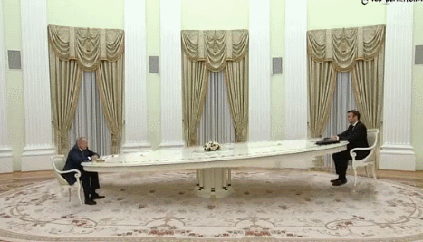 去年普京與馬克龍會談時,雙方坐在這張桌子較遠的兩頭。法方隨行人員透露,當時馬克龍拒絕俄方的新冠檢測,因此在會晤中與普京保持距離;俄方隨後也證實此為防疫時期保持社交距離的舉措,不是出於政治目的,也不會影響雙方會談。