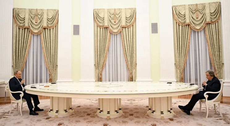 文章列舉道,普京去年與法國總統馬克龍、德國總理朔爾茨、匈牙利總理歐爾班以及聯合國秘書長古特雷斯等人舉行會談時,無一例外賓主雙方落座時都被這張長桌的最長端隔開。