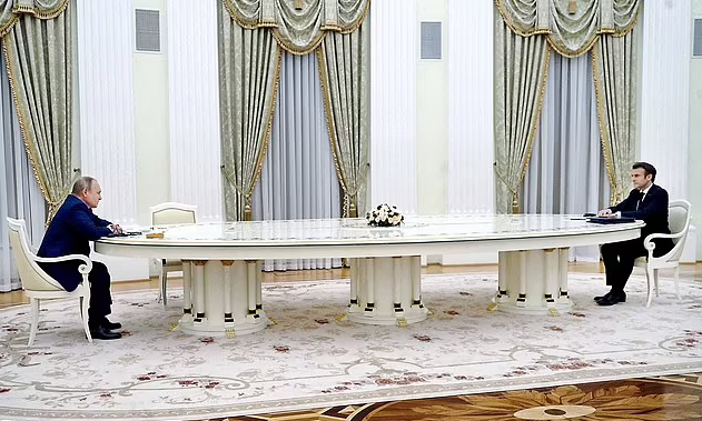 英國廣播公司(BBC)、澳大利亞廣播公司(ABC)等23日報道稱,普京喜歡在一張很長的桌子上與他人會面,過去他與會晤對象分別落座於長桌最遠兩端的照片相當出名,“雙方距離之遠,甚至讓人懷疑他們能否聽得見彼此的聲音。”