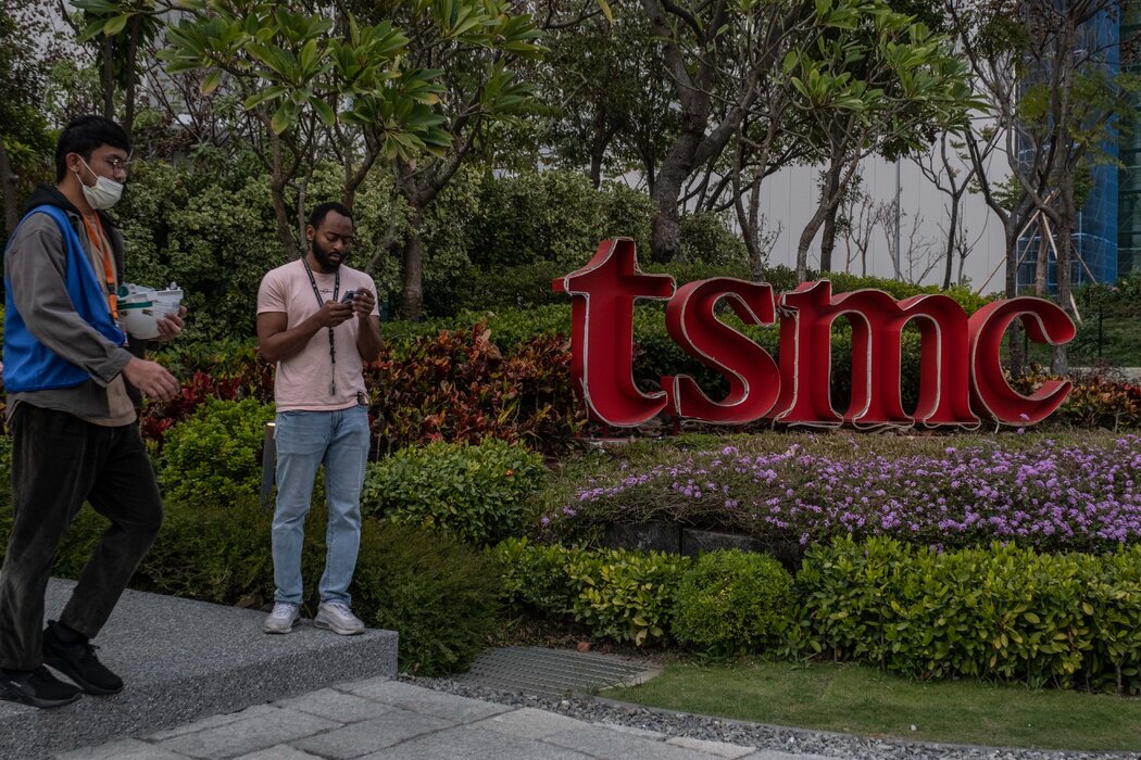站在台灣台南的一家台積電工廠外的美國員工。 圖片來源:《紐約時報》