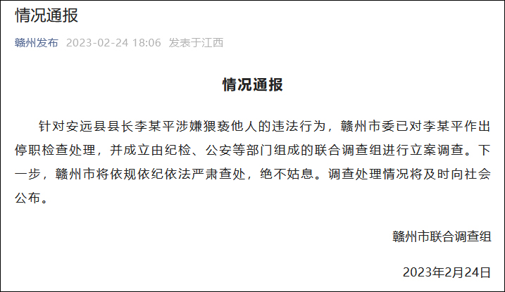 據江西贛州贛南日報社微信公眾號“贛州發佈”消息,針對安遠縣縣長李某平涉嫌猥褻他人的違法行為,贛州市委已對李某平作出停職檢查處理,併成立由紀檢、公安等部門組成的聯合調查組進行立案調查。下一步,贛州市將依規依紀依法嚴肅查處,絕不姑息。調查處理情況將及時向社會公佈。
