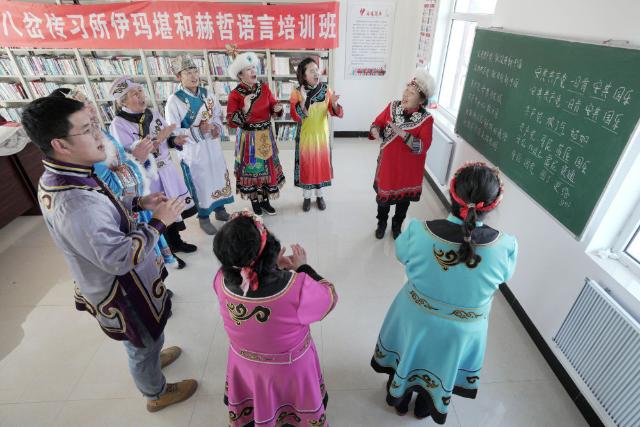 2月23日,在黑龍江省同江市八岔赫哲族鄉八岔村伊瑪堪傳習所,劉蕾(後右三)和學員一起向赫哲族伊瑪堪傳承人吳桂鳳(後右一)學習伊瑪堪。新華社記者 王建威 攝