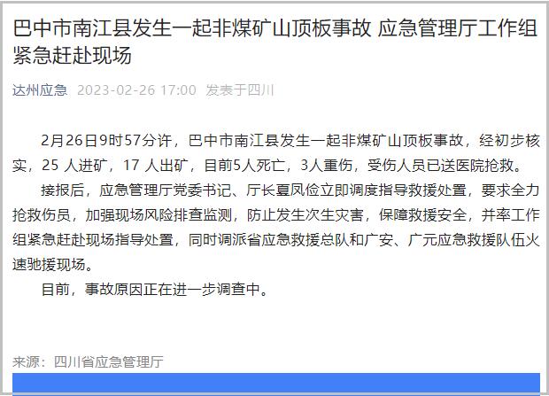 2月26日9時57分許,巴中市南江縣發生一起非煤礦山頂板事故,經初步核實,25 人進礦,17 人出礦,目前5人死亡,3人重傷,受傷人員已送醫院搶救。