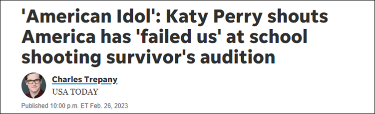 據美國有線電視新聞網(CNN)、《今日美國》等美媒2月26日報道,在當日播出的最新一集真人秀節目《美國偶像》中,評委之一的美國女歌手“水果姐”凱蒂·佩裏(Katy Perry),在選手講述完其從大規模校園槍擊案中倖存的經歷後,淚灑當場,並爆出髒話大罵美國在槍支管制上的失敗。之後,“水果姐”還呼籲做出改變,直言自己“也很害怕”。