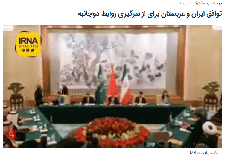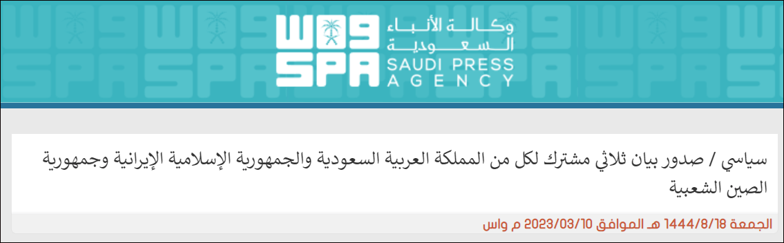 當日稍早時候,伊通社報道了這一消息,併發布了協議簽署當時的視頻畫面。據伊通社報道,沙特、伊朗、中國在聯合聲明中表示,三國“將盡一切努力加強地區和國際的和平與安全”。