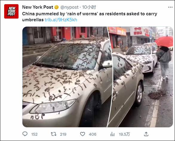 《紐約郵報》在報道中寫道:“在看起來像是下起了‘蟲雨’(rain of worms)後,中國遼寧省的市民被告知要找避難所。”