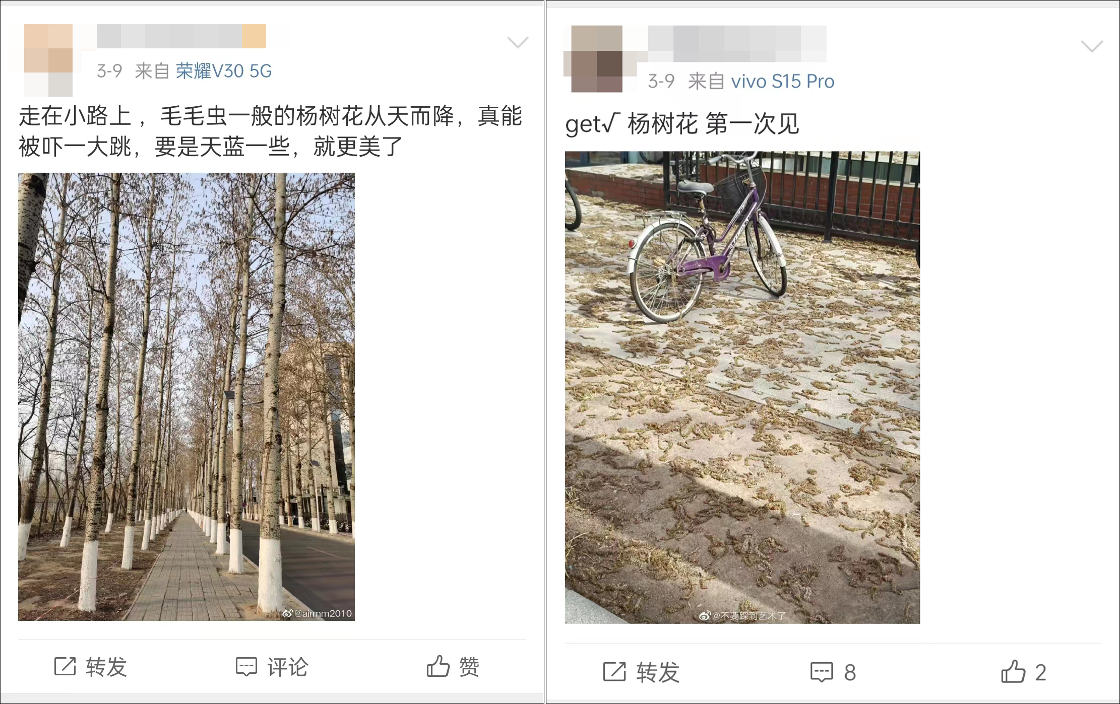 隨着春天來臨,天氣漸暖,眾多網友紛紛在社交媒體上更新動態,曬出了他們與楊樹花的邂逅。