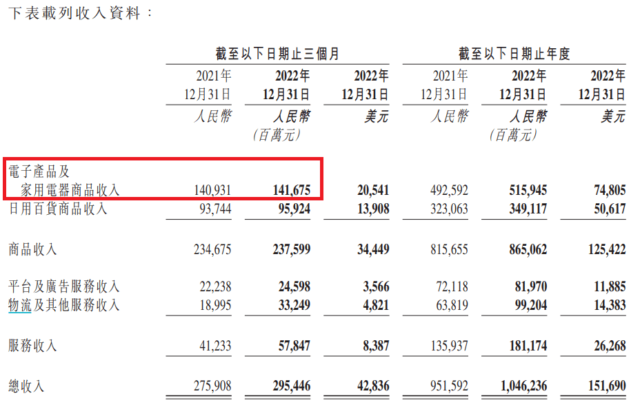 但這也提醒了京東一個問題:京東需要培育更多的核心競爭力。財報顯示,2022年Q4,京東日用百貨商品收入同比增幅也不大。