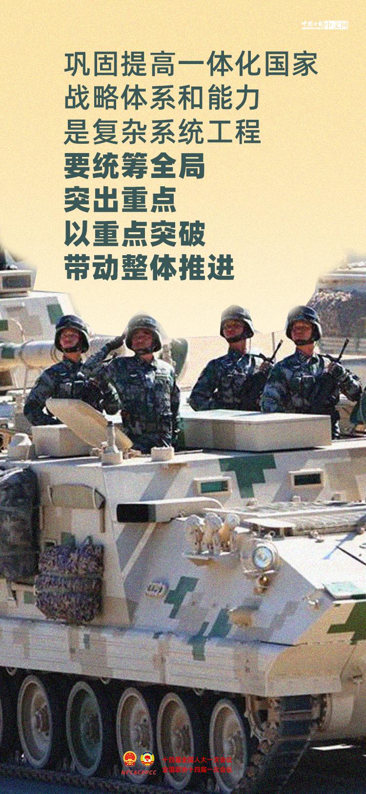 中共中央總書記、國家主席、中央軍委主席習近平 8 日下午出席十四屆全國人大一次會議解放軍和武警部隊代表團全體會議。在 6 位代表發言後,習近平發表重要講話,重點圍繞鞏固提高一體化國家戰略體系和能力提出要求。鞏固提高一體化國家戰略體系和能力怎麼做?一起來看。