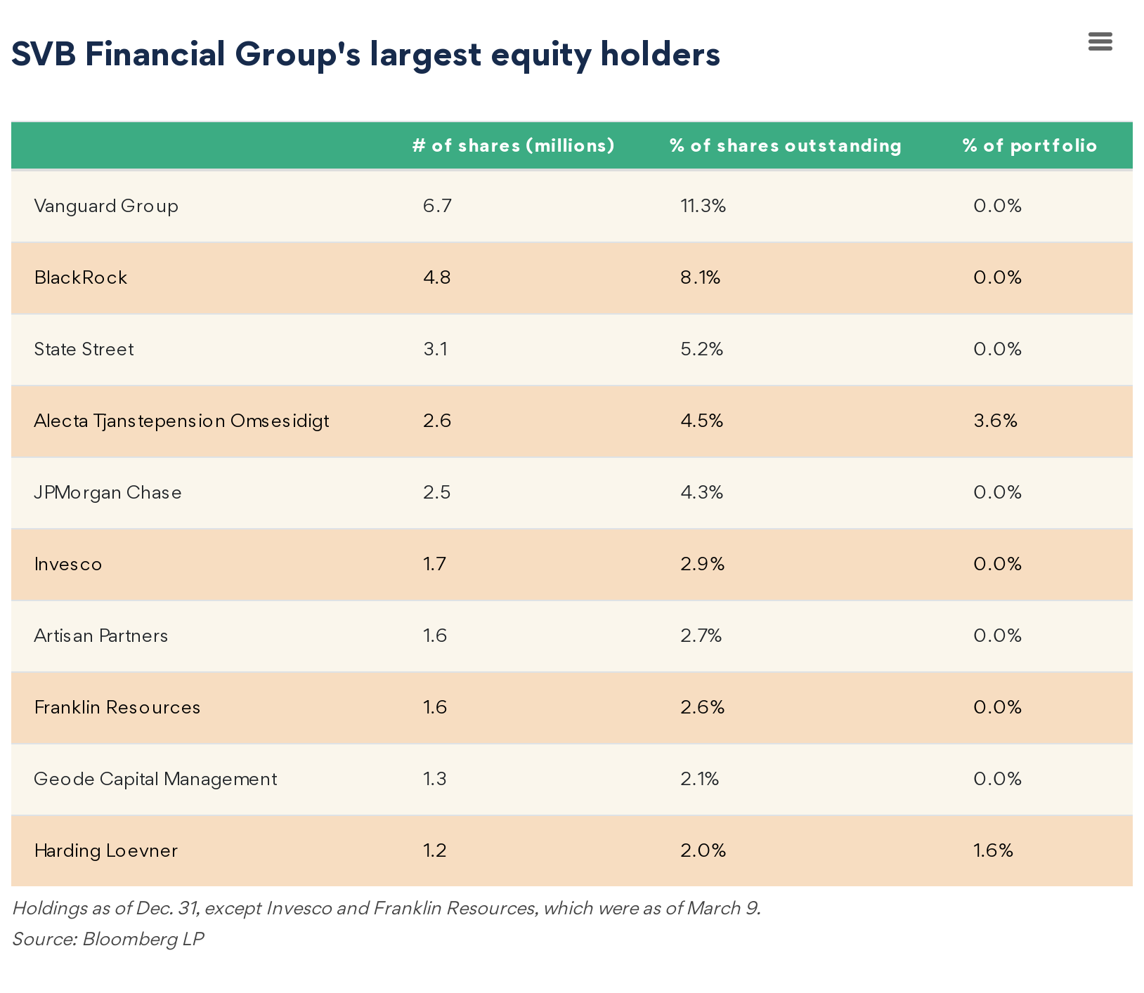 SVB最大持股人的股票數量、股比和總投資額比例(圖源:彭博社)