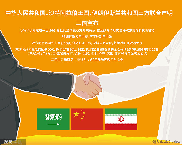 中沙伊三國發表聯合聲明 沙特和伊朗宣佈恢復兩國外交關係。(視覺中國)