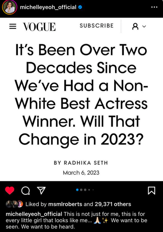 當地時間3月7日,在奧斯卡投票結束前幾個小時,楊紫瓊在Instagram分享了美國時尚雜誌《Vogue》一篇文章的截圖,該文題為《我們已經二十多年沒有非白人影后了,2023年這種情況會改變嗎?》,該文在Vogue網站的題圖為2002年憑藉《死囚之舞》拿下奧斯卡影后的黑人女星哈利·貝瑞。