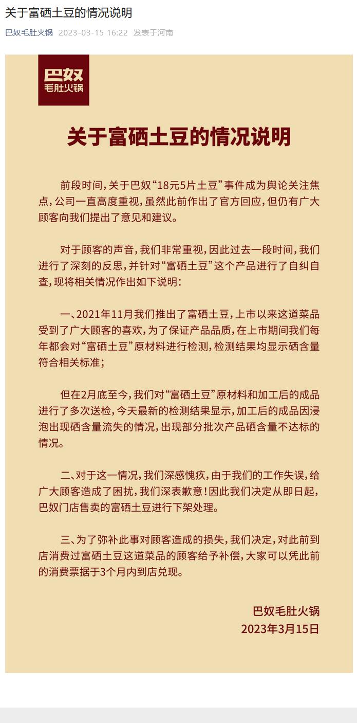 巴奴表示,前段時間,關於巴奴“18元5片土豆”事件成為輿論關注焦點,公司一直高度重視,雖然此前作出了官方回應,但仍有廣大顧客向公司提出了意見和建議。對於顧客的聲音,公司非常重視,因此過去一段時間,我們進行了深刻的反思,並針對“富硒土豆”這個產品進行了自糾自查,現將相關情況作出如下説明: