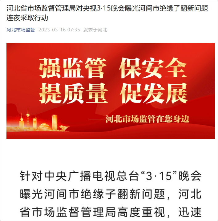據微信公眾號“河北市場監管”3月16日消息,針對中央廣播電視總枱“3·15”晚會曝光河間市絕緣子翻新問題,河北省市場監督管理局高度重視,迅速落實省委、省政府領導要求,立即採取行動。當晚派出局領導帶隊的專項工作組,趕赴現場督促指導滄州市、河間市調查處置。同時,連夜組織全省各地對類似產品生產企業開展全面排查整治,切實保障人民羣眾生命財產安全。