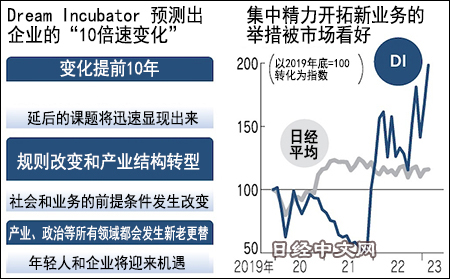 該公司的商業模式也發生了劇烈變化。Dream Incubator壓縮了投資和保險業務,把資源集中到幫助企業客户建立新業務;增加外部董事人數至過半,並開始公佈中期經營計劃,提高了經營透明性和可預見性。雖然也曾面臨因總市值不達標而退出東證主要市場的危機,但其股價今年最終達到了2019年底的2倍。