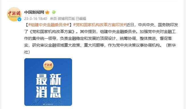 近日,中共中央、國務院印發了《黨和國家機構改革方案》。其中提到,組建中央金融委員會。加強黨中央對金融工作的集中統一領導,負責金融穩定和發展的頂層設計、統籌協調、整體推進、督促落實,研究審議金融領域重大政策、重大問題等,作為黨中央決策議事協調機構。