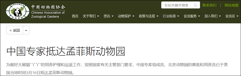 中國動物園協會網站發佈消息稱,為做好大熊貓“丫丫”的飼養護理和運返工作,按照國家有關主管部門要求,中國專家組成員、北京動物園的獸醫和飼養員已於美國當地時間3月16日抵達孟菲斯動物園。
