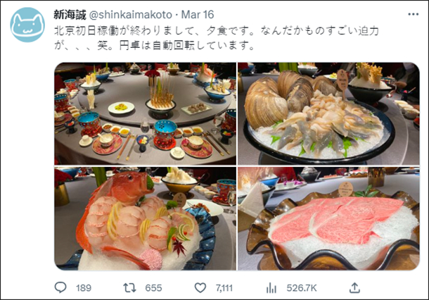 而一到北京,新海誠在推特上曬出的晚餐就引發不少網民關注——“在北京第一天的工作結束了。這個晚飯太豪華太震撼啦……笑。圓桌還會自己轉。”