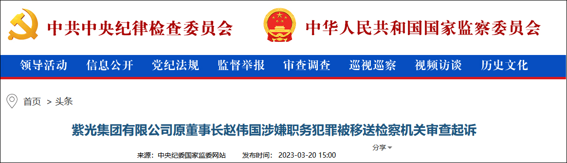 紫光集團原董事長趙偉國涉嫌職務犯罪被移送檢察機關審查起訴
