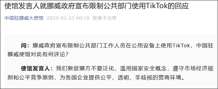 據微信公眾號“中國駐挪威大使館”3月23日消息,中國駐挪威大使館發言人回應挪威政府宣佈限制公共部門使用TikTok。