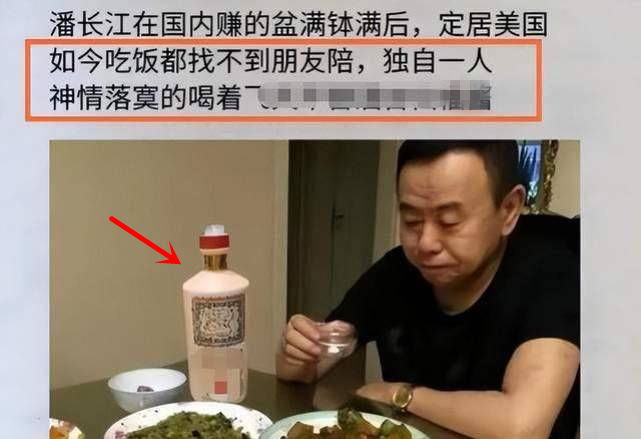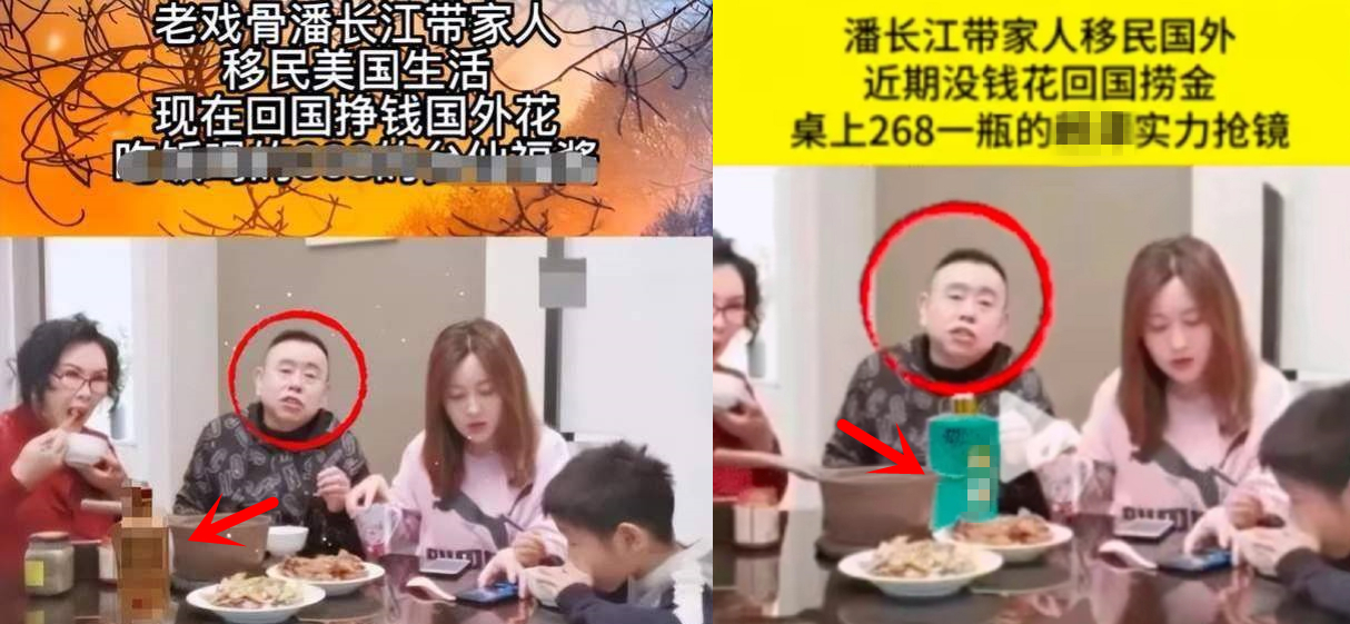 有人還放出所謂“潘長江一家在美國豪宅吃飯”的照片。值得一提的是,這些照片都疑似在飯桌上P了一瓶酒,圖片上方顯示“桌上XXX元一瓶的XX實力搶鏡”或“潘長江喝着XXX”的字樣。