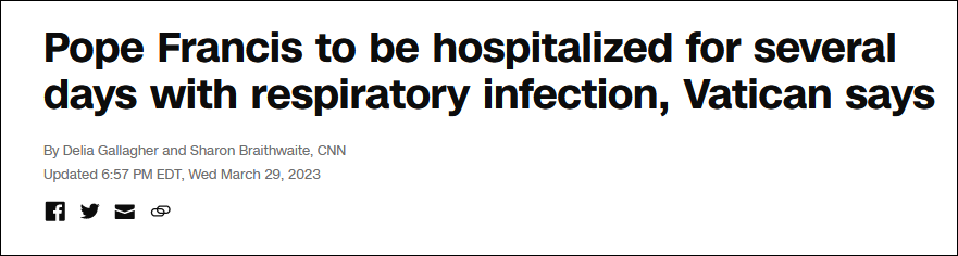 (觀察者網訊)據美國有線電視新聞網(CNN)報道,梵蒂岡方面當地時間3月29日表示,86歲高齡的羅馬教皇方濟各因呼吸道感染,需要在羅馬的一家醫院住院“數天”。