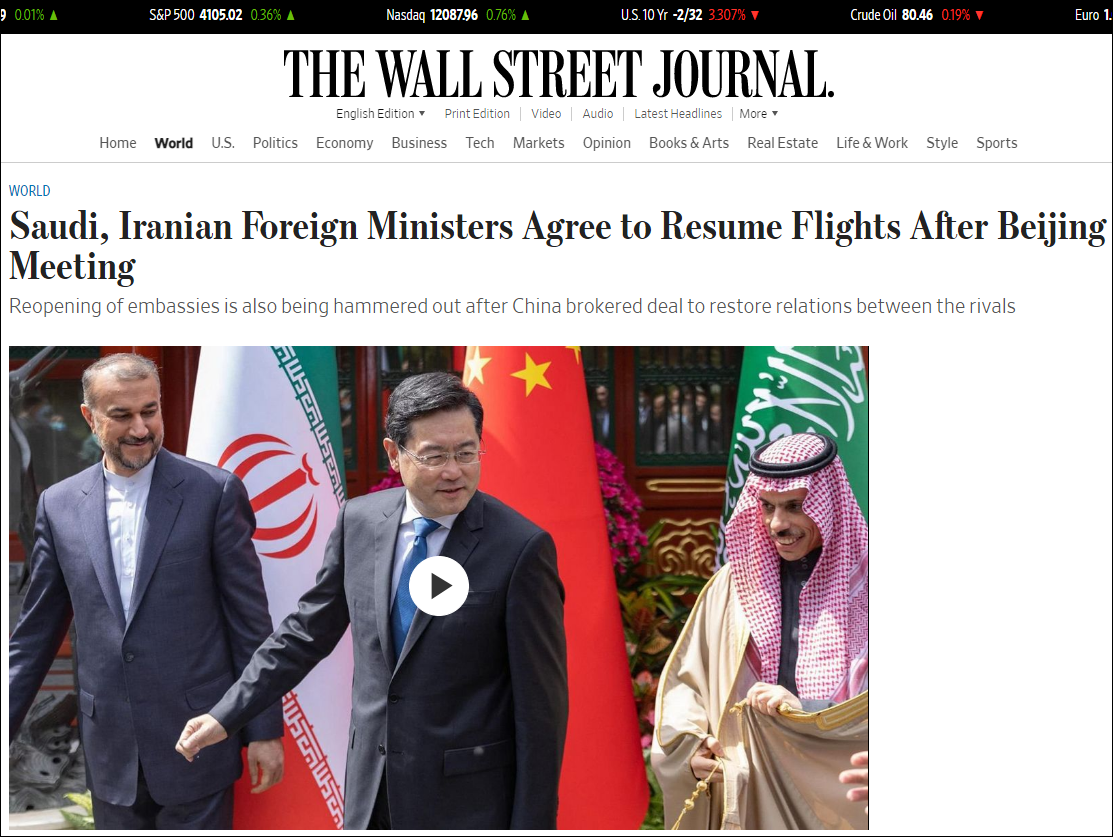 《華爾街日報》認為,“沙伊北京和解”讓外界驚訝地意識到了中國在中東地區的重要影響力,此事不但加速了中東地緣政治的重新調整,更標誌着中美競爭邁入新階段。而《華盛頓郵報》的評論文章則圍繞近期沙特領導眾多產油國減產一事指出,美國在中東的“霸權時代”或許已然結束。