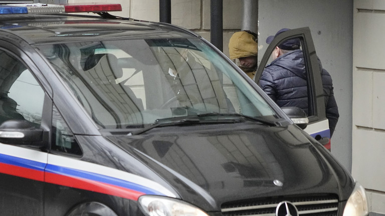 3月30日,莫斯科,《華爾街日報》的記者埃文·格什科維奇在俄方官員陪同下走向汽車(美聯社圖)