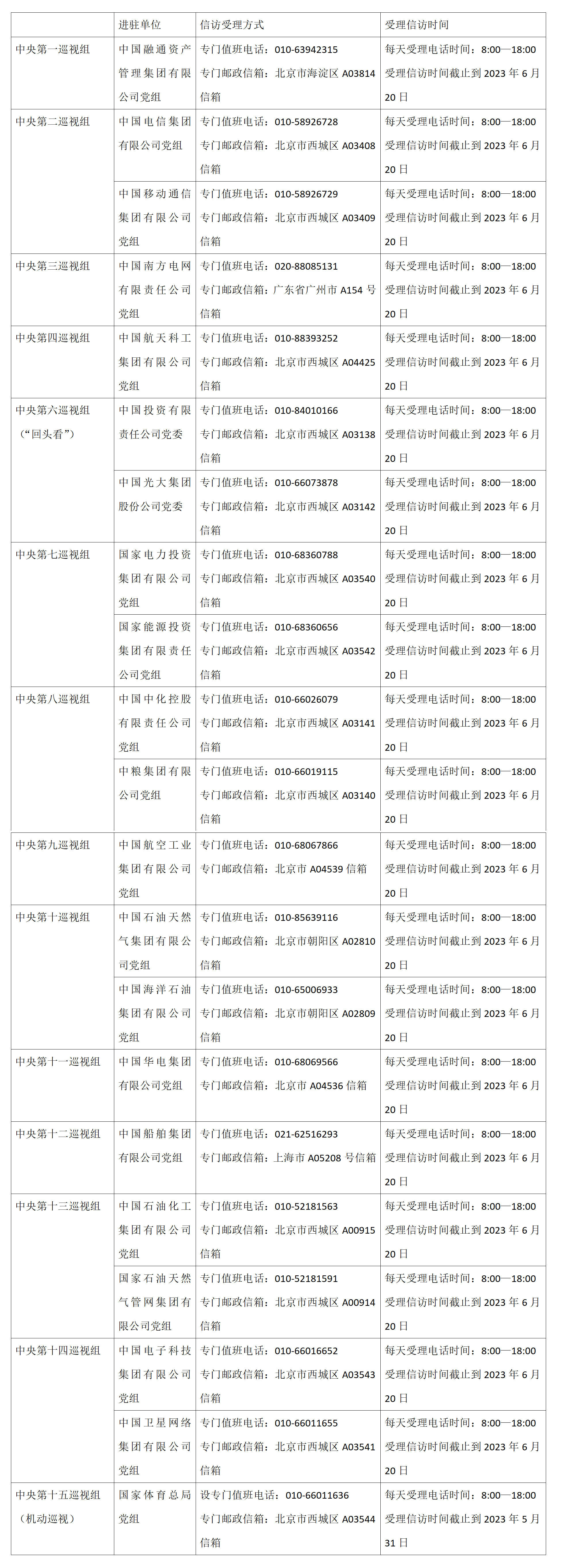 日前,二十屆中央第一輪巡視的15個巡視組開始陸續進駐被巡視單位黨組織開展巡視工作。第二批集中進駐的21家被巡視單位信訪受理方式已經公佈。