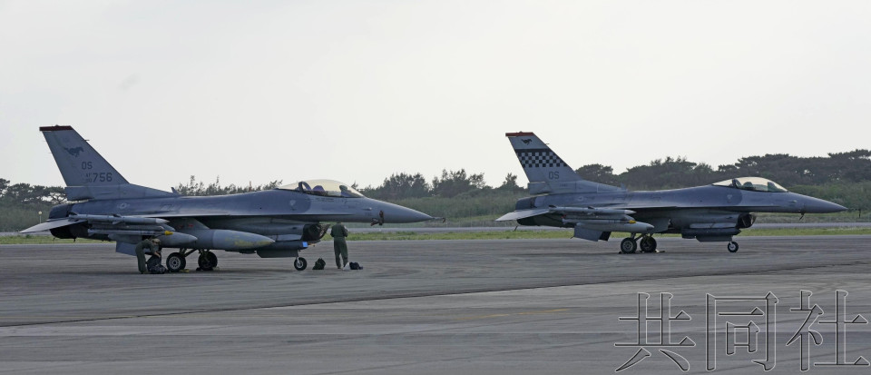 4月8日在下地島機場緊急着陸的美軍F-16戰機。圖自共同社