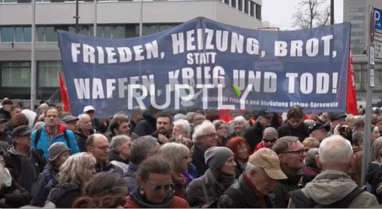 當地時間3月8日,大約1500人走上了柏林街頭,要求德國政府停止向烏克蘭援助武器,並促成俄烏停火。視頻顯示,抗議者們手持標語、旗幟和橫幅,橫幅上寫着“要和平、供暖和麪包,不要武器、戰爭和死亡”。