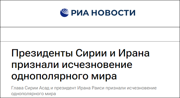 敍利亞總統辦公室在社交平台上發佈消息稱,敍利亞和伊朗兩國領導人在通話中表示,由於堅持主權和尊嚴的人民和國家保持警惕,單極世界正在消失。