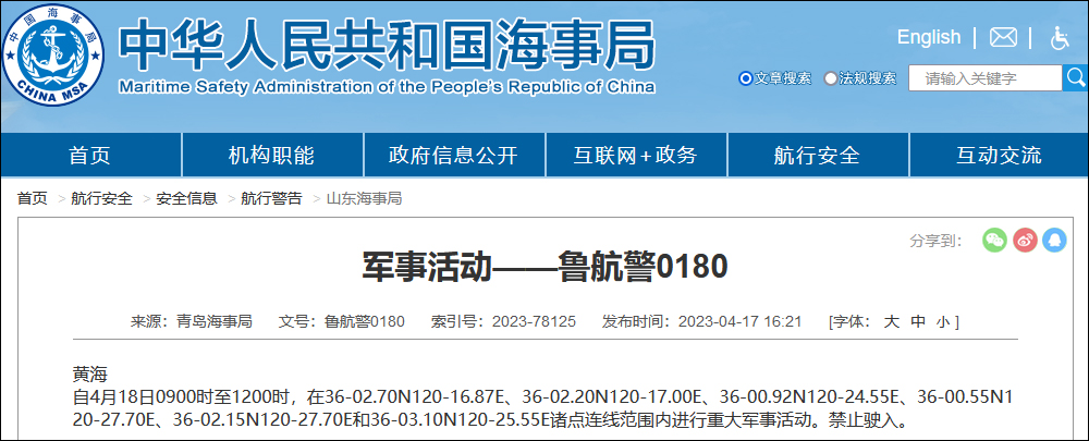 據中國海事局網站4月17日消息,青島海事局發佈航行警告:4月18日9時至12時,黃海部分海域進行重大軍事活動,禁止駛入。