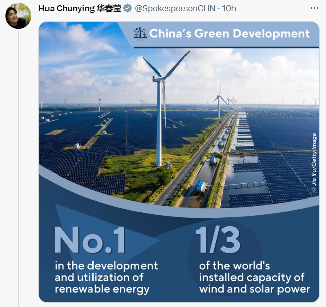 華春瑩在推特發文寫道:“實現人與自然和諧相處的中國式現代化,將為建設一個清潔美麗的世界提供更加可行的路徑。”