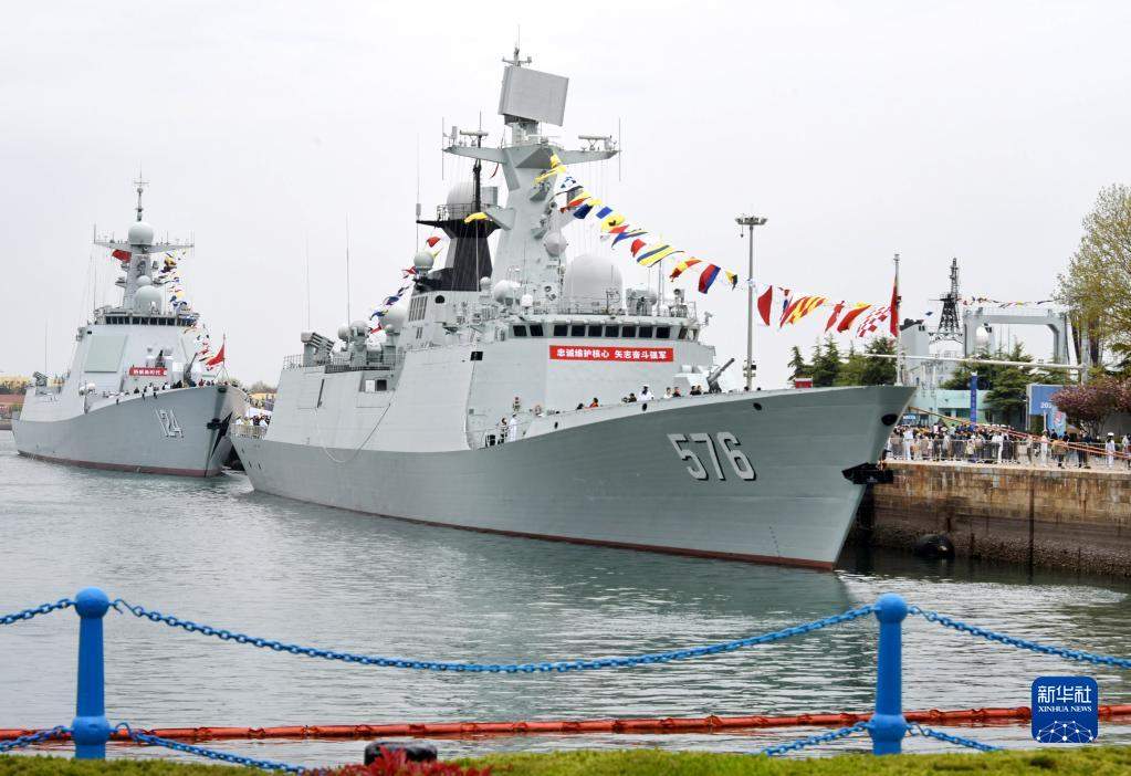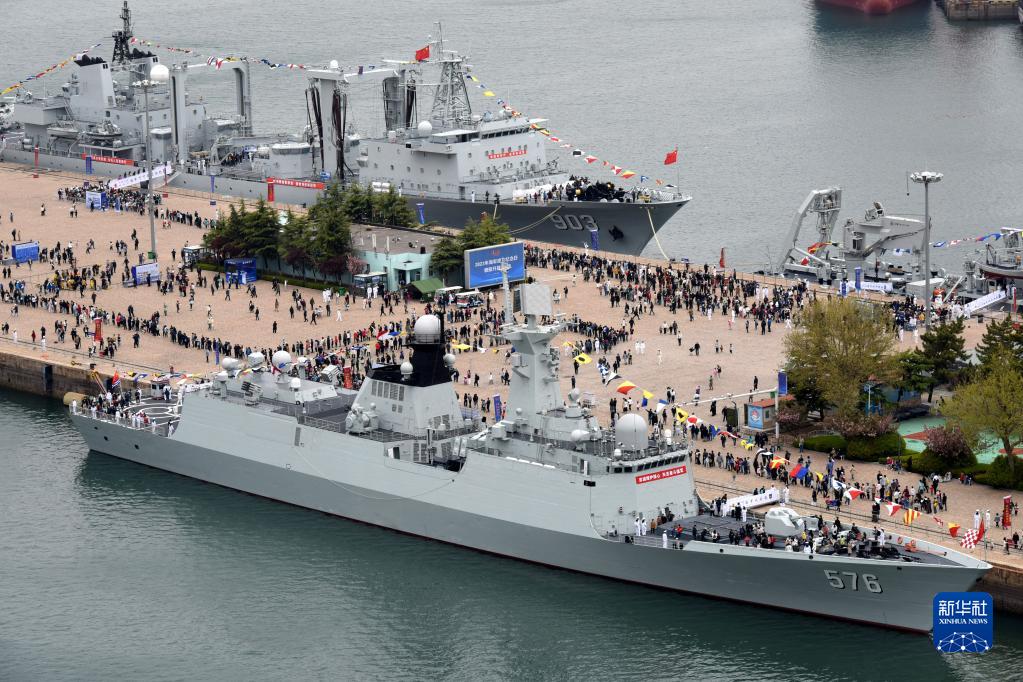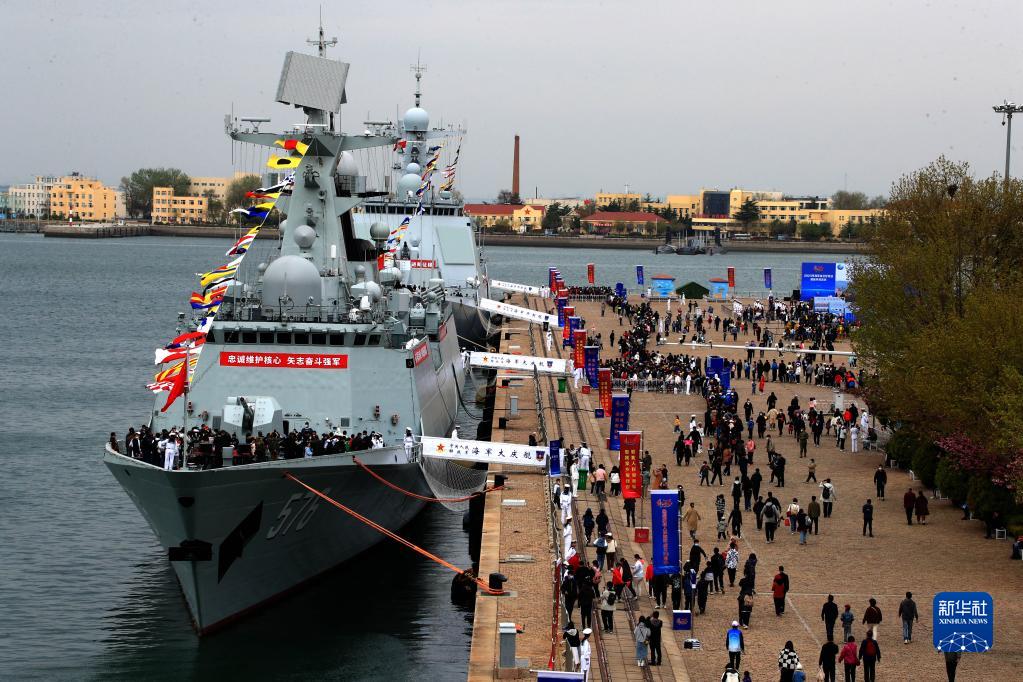 4月22日,海軍在青島的3號碼頭組織導彈驅逐艦開封艦、導彈護衞艦大慶艦、綜合補給艦可可西里湖艦、綜合援潛救生船洪澤湖船進行靠泊展示。新華社記者 李紫恆 攝