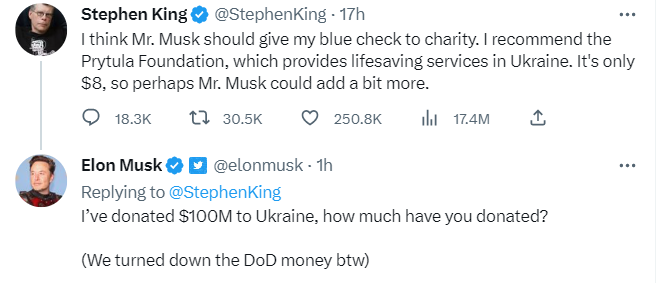 結果,對“送認證”名單不作解釋的馬斯克出現了,他當地時間22日向“教自己做事”的斯蒂芬·金髮問:“我給烏克蘭捐了1億美元,你捐了多少?”