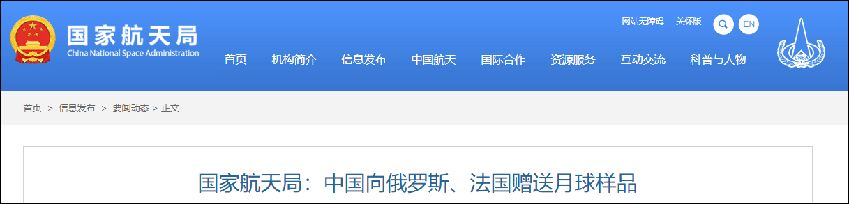 國家航天局:中國向俄羅斯、法國贈送月球樣品