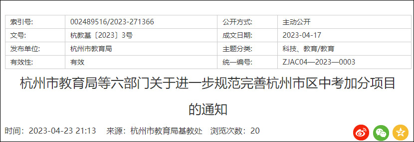 為深入貫徹黨的二十大精神,促進教育公平,現就進一步規範完善杭州市區(指上城區、拱墅區、西湖區、濱江區、錢塘區和西湖風景名勝區,以下簡稱市區)初中學業水平考試(以下簡稱中考)加分項目有關事項通知如下。