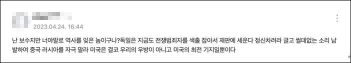 “雖然我保守,但你才是忘記歷史的傢伙啊!德國現在還在抓捕戰犯並審判他們。清醒點吧,別再胡説八道激怒中國和俄羅斯了。美國絕不是我們的友邦,我們只是美國最前方的軍事基地罷了。”